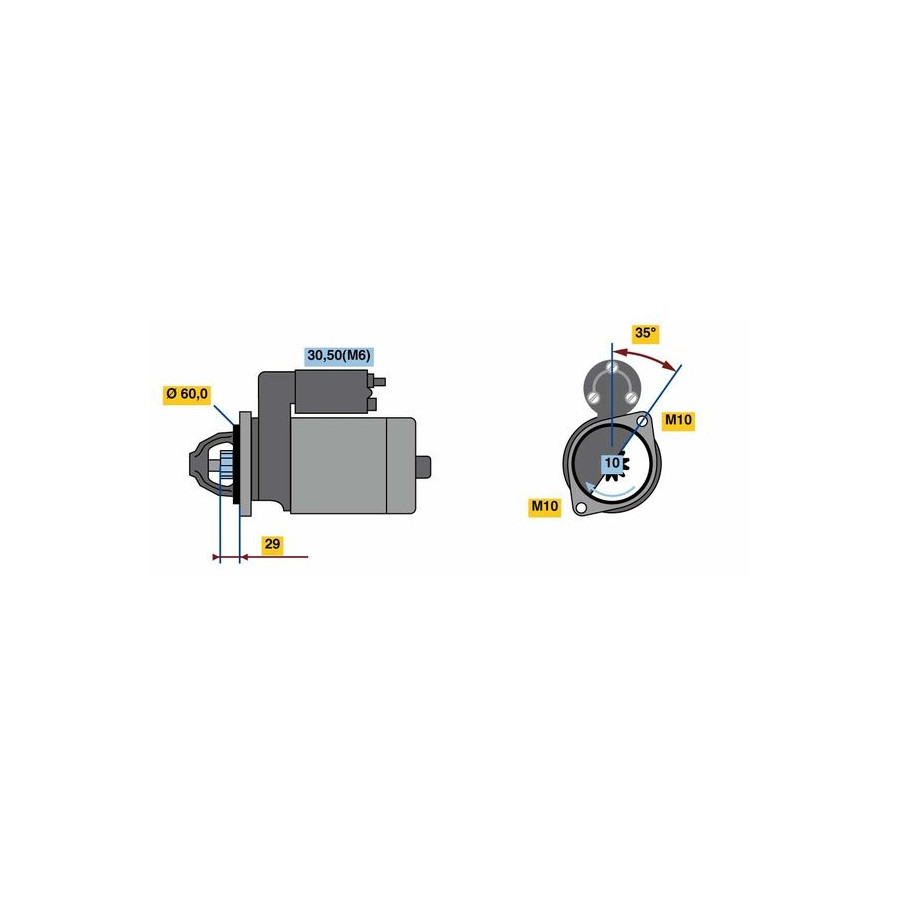 Number of Teeth 10 Rated Power [kW] 1,7 Number of mounting bores 0 Rotation Direction Clockwise rotation Voltage [V] 12 Thread Size M10 Thread Measurement 1 M10x1.5 Position / Degree Right (passenger side) Clamp 50 30 Guarantee 2 years Connecting Angle [Degree] 35 Number of Thread Bores 2 Length [mm] 254 Pinion start position [mm] 26,4 starter Version Without top bearing Jaw opening angle measurement [Degree] 35 Fastening hole angle measurement [Degree] 35 Flange diameter [mm] 60 Similar products of other manufacturers