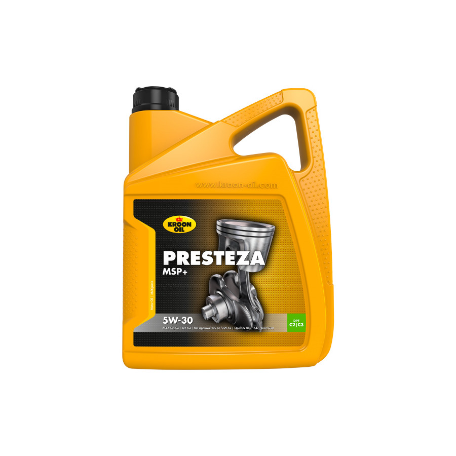 Presteza MSP 5W-30 from Kroon oil is a fuel-saving synthetic motor oil, specially developed for the latest generation of passenger cars that are equipped with a particulate filter and/or a catalytic converter. Due to the special Mid-SAPS techniques, these last longer. Specially selected base oils and advanced additives have been combined to obtain the following properties: