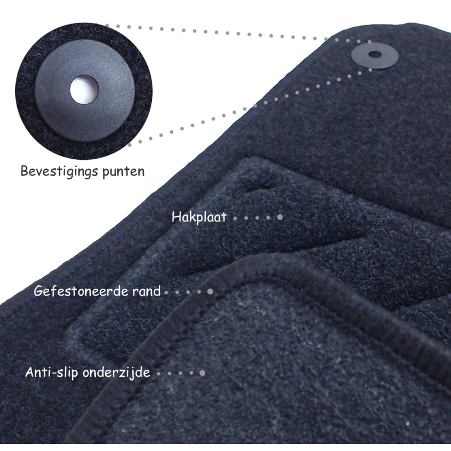The car mats are made of high-quality needle felt carpet. A heel pad is also attached to the driver's mat, further enhancing its durability. The underside is made of granulate, a non-slip layer that prevents the mats from slipping. The mats also have the standard mounting holes, just like the originals, so you can quickly and easily click them into place in your car (in some cases, the mounting rings may need to be transferred). The edge of the mat is finished with a scalloped edge.Car mats provide an important barrier between your car's carpet and the dirt and moisture from shoes, etc. These mats are specially designed to protect your carpet and floor from moisture, dirt, wear, and salt. If your car mats are worn out or you don't have them installed at all, dirt and moisture can leave permanent stains on your carpet. They can also seep through to your floor, which can then rust. These mats prevent this.