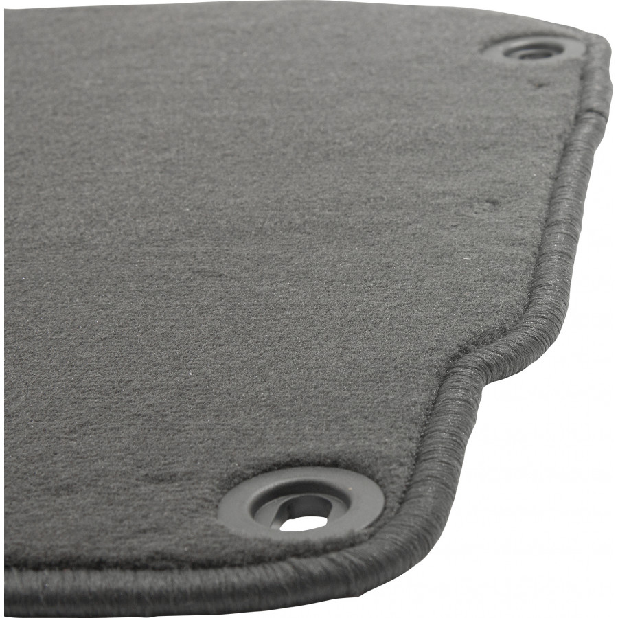 These car mats are made of durable black velour and feature a scalloped edge, giving them a luxurious look. They also have the standard mounting holes so you can easily click them into your car, just like the originals. They also have a granulate anti-slip layer to prevent the mats from slipping.