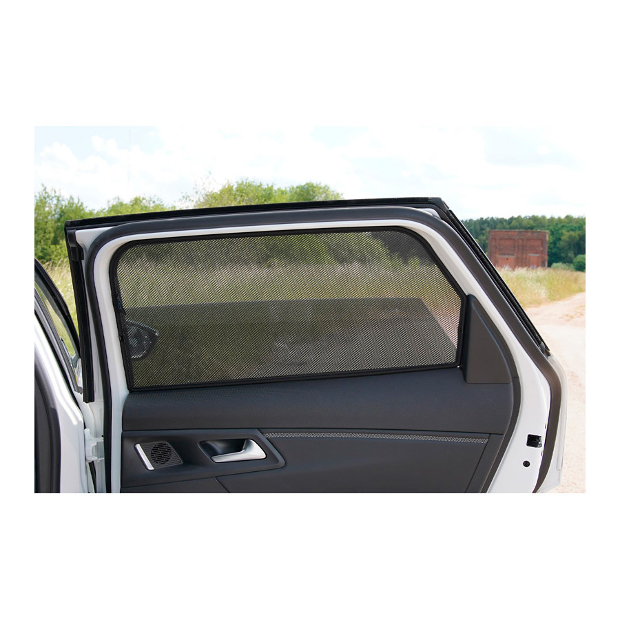 Set of ready-made Car Shades sun blinds for the rear doors, perfect during the beautiful summer weather, long holiday drives and especially for your passengers. The sunshades keep out the bright sun and, thanks to the specially woven cloth structure, they give your car a nice, discreet appearance, giving your windows the look of tinted windows. You simply click the Car Shades between your window styles and remove them just as easily.