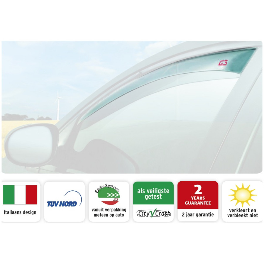 The G3 side wind deflectors offer you great benefits all year round. You can leave your windows open even when it rains and in the summer you have excellent ventilation without wind noise through the open windows. The slim, aerodynamic design and light tint of the side wind deflectors make them a great addition to any vehicle. With the G3 Quick-Fit System you can mount the side wind deflectors quickly and easily.