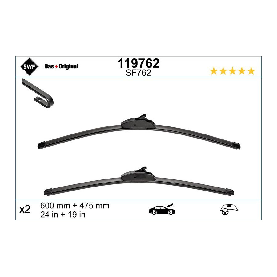 Driver position: For left-hand drive vehicles Wear is: Without wear warning contact Length 1/2 mm: 600/475 Number of wear: 1 Adding the adapter: U Packing unit: 00001 Brand nr: 762 Brand: SWF Level: